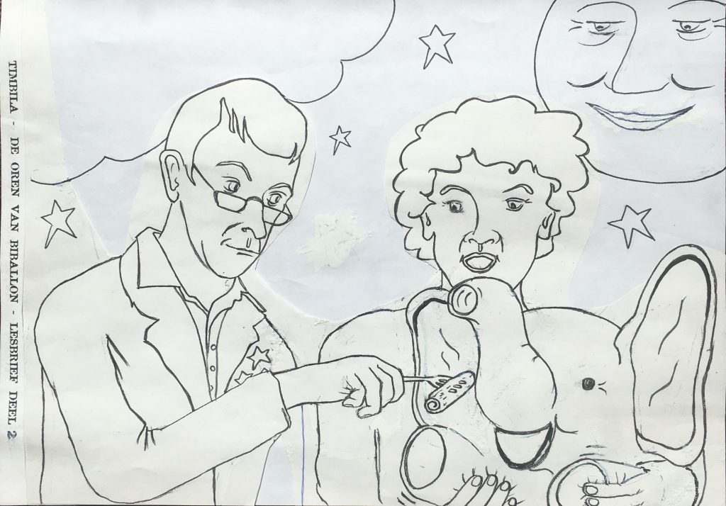 En ook hier, net als bij de muziek-schoolvoorstellingen van Timbila, bestond een flink deel van de klus uit het samenstellen van lesmateriaal. Het tekenen van Hubert, mezelf en Biballon in kleurplaat-stijl was een leuk werkje.